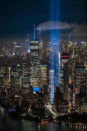 The 9/11 Tribute Lights framed around the Empire State Building