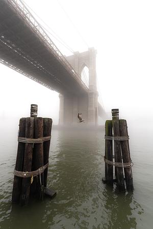 Fog covers the Brooklyn Bridge