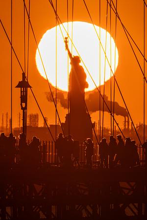 The sun sets behind the Statue of Liberty